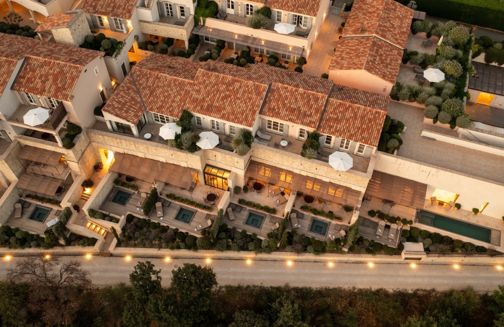 Inspirées de l’*aiguier* provençal, les terrasses sont dotées de bains d'hydrothérapie intégrés dans un élégant decking en bois, offrant une vue apaisante sur les collines et vignobles environnants. La vaste suite Cassiopée pousse encore plus loin la détente avec un solarium, une piscine de nage et un sauna privé. Pour les séjours en groupe, plusieurs suites peuvent être reliées par des couloirs et des terrasses, pouvant ainsi accueillir jusqu’à 10 adultes et des enfants supplémentaires.